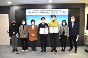 하남시(시장 김상호)는 지난 15일 ‘가정폭력·성폭력 공동대응팀’ 운영을 위해 하남경찰서와 업무협약을 하고 시청 대회의실에 공동대응팀 사무실을 마련, 현판 제막식을 했다고 밝혔다.하남시청에서 가진 이날 행사에는 김상호 시장, 이대형 하남경찰서장, 경기도 여성정책과 관계자 등이 참석했다.가정폭력·성폭력 공동대응팀은 사건 발생 시 하남시와 경찰의 개별 대응에 따른 한계를 보완하기 위해 공무원-경찰-상담전문가 등이 원스톱으로 처리해 신속성과 효율성을 높이는 것이다. 경기도 공모사업에 선정돼 하남시와 부천시 2곳에 시범 설치됐다.이번 협약
