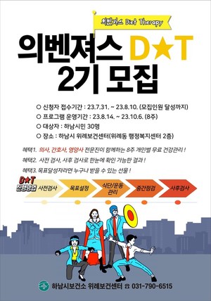 남시(시장 이현재)는 오는 10일까지 ‘의벤져스 다이어트 테라피(DT) 프로그램’에 참여할 참가자를 모집한다고 밝혔다.‘의벤져스 DT 프로그램'은 의사·간호사·영양사로 이루어진 전문가 그룹이 프로그램 참가자의 개인별 건강 상태를 체크해 건강관리 방향을 컨설팅하는 맞춤형 서비스로, 이달 초부터 8주간 진행된다.전문가 그룹은 신체 계측과 체성분 측정, 식단 설문 및 영양지수 체크 등 종합 결과를 토대로 개인별 목표를 설정하고 건강한 체중감량 및 올바른 생활 습관 형성이 이루어질 수 있도록 밀착 케어한다.앞서 위례동주민자치센터 운동프로그