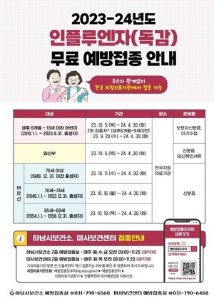 하남시(시장 이현재)는 이달 20일부터 내년 4월 30일까지 어린이와 임신부, 노약자 등을 대상으로 독감(인플루엔자) 백신을 무료로 접종한다고 21일 밝혔다.무료접종 대상은 △생후 6개월 이상∼13세 이하의 영유아 및 어린이 △임신부 △65세 이상 노인 및 의료취약계층 등 독감 고위험군이다.하남시는 원활한 예방접종을 위해 연령 및 대상별로 시기를 나눠 접종을 시행한다.독감 주사를 처음 맞는 생후 6개월 이상 ~ 9세 미만의 2회 접종 대상자부터 이달 20일 접종을 시작한다.이어 ▲(10월 5일부터) 13세 이하 1회 접종 대상자와
