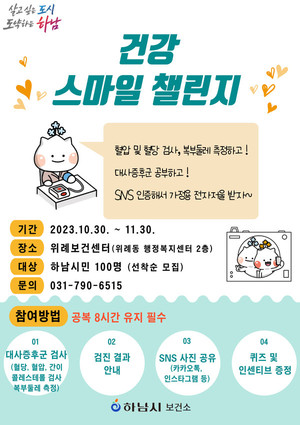 하남시(시장 이현재)가 시민의 대사증후군 발견과 건강 상태 체크를 위해 ‘건강 스마일 챌린지’를 운영한다.대사증후군은 복부비만, 고혈당, 고혈압, 고지혈증 등의 위험인자가 3개 이상 해당하는 상태를 말하며 각종 암 발생과 사망률과도 관계가 있어 혈압·혈당·간이콜레스테롤 검사, 복부둘레 측정으로 이상 소견을 발견하는 등 세심한 관리를 통해 위험도를 낮추는 것이 중요하다.이에 시는 “하남시 위례보건센터에서 30일부터 11월 30일까지 1개월간 ‘건강 스마일 챌린지’를 진행한다”고 27일 밝혔다.이번 챌린지는 하남시민이라면 누구나 선착순