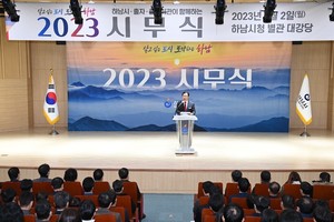 하남시(시장 이현재)는 2일 시청 별관 대강당에서 ‘2023년 하남시 시무식’을 갖고, “오로지 시민만을 바라보며 최상의 시민복지 서비스를 제공하겠다”고 다짐하며 2023년 새해를 힘차게 출발했다.시무식에는 이현재 시장을 비롯해 직원 및 하남도시공사·하남문화재단 임직원 등 400명이 참석했다.이현재 시장은 시무식에서 신년사를 통해 “2023년 하남시는 새롭게 혁신해 그동안의 오래된 습관을 버리고, 오로지 시민만을 바라보며 힘차게 나아가겠다”며 “올해 하남시 시정혁신의 목표는 고객인 시민들에게 대한민국 최고의 행정서비스를 제공하는 것