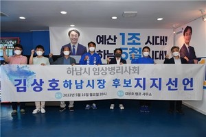 하남시물리치료사회와 하남시임상병리사회는 지난 16일 더불어민주당 김상호 하남시장 후보에 대한 지지를 공식적으로 선언했다고 밝혔다.김상호 후보 캠프를 찾은 하남시물리치료사회와 하남시임상병리사회 회장 및 회원들은 정책제언을 위한 간담회를 가진 후 지지선언문을 낭독했다.이혁종 하남시물리치료사회 회장은 “김상호 후보는 약속한 말을 꼭 지키는 확실한 후보, 경험과 실력을 겸비한 유능한 후보, 하남을 더 빛나게 만들 수 있는 후보”라며 “‘시민과 함께, 미래의 하남’으로 나아가기 위해 김상호 하남시장 후보에 대한 적극적인 지지를 선언한다”고