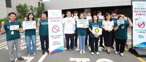 경기융합타운 입주기관들이 일회용품 없는 친환경적인 업무 문화를 위해 뜻을 모았다. 경기도교육청은 실천 수칙을 마련해 경기교육가족을 대상으로 지속적인 홍보에 나선다.경기도교육청, 경기도청, 경기도의회는 6일 자원순환의 날을 맞아 일회용품 없는 경기융합타운 조성을 위해 지하 1층 출입구에서 합동 캠페인을 펼쳤다.경기융합타운 입주기관들의 청사 내 일회용품 사용 제한과 일회용 컵 반입 금지 홍보를 위해 마련된 이번 캠페인에는 이경희 경기도교육청 제1부교육감, 염태영 경기도 경제부지사, 김종석 경기도의회 사무처장 등 30여 명이 참여했다.참