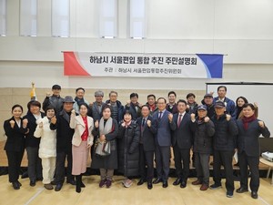 하남시 서울편입 추진과 관련하여 통합추진위원장 김택규 외 14명은 지난 30일 3차 회의를 통해 권역별 주민설명회를 개최하기로 결의했다. 이에 따라 첫 번째 주민설명회를 하남시장애인복지관에서 5일 개최했다.이날 미사지역 주민설명회에는 하남시 서울편입통합추진위 김택규 통합위원장을 비롯해 박여동, 현교태, 송재백, 김병찬, 구교영 지역회장 및 현영석 특별추진위원장 등 50여명이 참석했다.국민의힘 하남시당협 이창근 위원장은 경제학자로서 서울편입과 관련해 객관적인 자료를 바탕으로 참석자들에게 강연했다.이창근