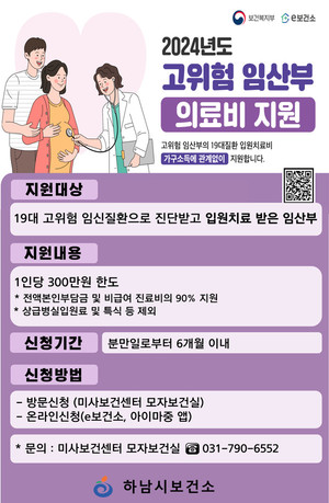 하남시(시장 이현재)는 지난해까지 중위소득 180%이하 가구에 한정했던 ‘고위험 임산부 의료비 지원’이 올해부터 소득기준이 폐지됨에 따라, 보다 많은 임산부들이 혜택을 받을 수 있도록 사업 신청을 적극 독려하고 있다.'고위험 임산부 의료비 지원 사업'은 인공임신 시술에 따른 다태아 증가 등으로 고위험 임신 빈도가 증가함에 따라, 임산부의 경제적 부담 완화와 건강한 출산을 돕기 위해 추진하는 사업이다.올해부터 소득기준을 폐지하면서 보다 많은 임산부가 혜택을 받게 될 것으로 예상된다.지원 대상은 ▲다태임신 ▲조기진통 ▲분만출혈 ▲중증
