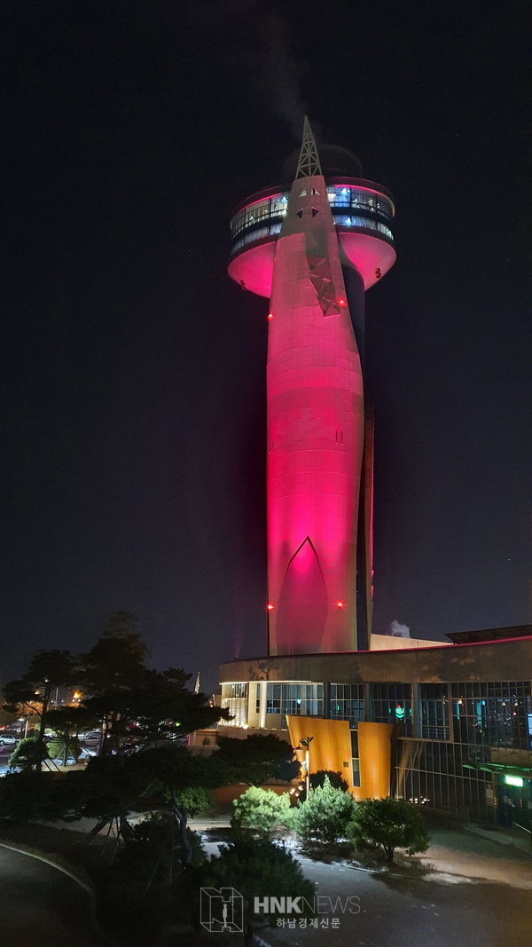 하남유니온타워 전망대 외벽에 설치된 LED 조명은 평소에는 8가지 색으로 다양한 경관 이미지를 연출하다가 미세먼지가 나빠지면 경고 표시를 하게 된다.