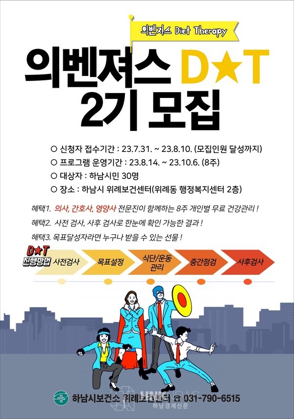 남시(시장 이현재)는 오는 10일까지 ‘의벤져스 다이어트 테라피(DT) 프로그램’에 참여할 참가자를 모집한다고 밝혔다.