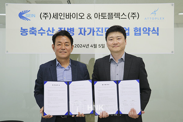 김윤영 대표는 “이번 업무협약을 통해 세인바이오의 마케팅 역량과 아토플렉스의 차세대 진단 혁신기술이 융복합해 축산농가의 질병 진단비용 절감에 크게 기여할 것”이라고 전했다.