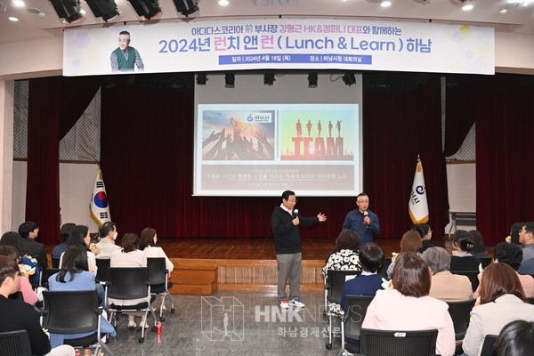 하남시는 18일 시청 본관 대회의실에서 공직자 150여명이 모인 가운데 진행된 ‘2024년 런치앤런’(Lunch&Learn) 특강에 강형근 대표를 초빙해 ‘조직과 자신의 행복한 성장을 이끄는 차세대 리더의 자기경영 노트’를 주제로 한 명사초청 특강을 진행했다.