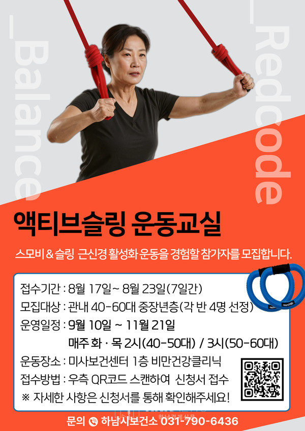 한편, ‘액티브슬링 운동교실’과 관련한 자세한 사항은 하남시 건강증진과 건강증진팀(☎031-790-6436)으로 문의하면 된다.