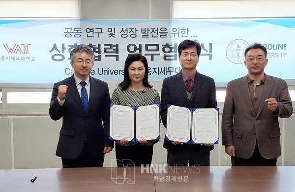 웅지세무대학교(이사장 송상엽)는 20일 오전 11시, 파주에 위치한 세무대학교 국제회의실에서 미국 캐롤라인대학교(총장 제임스 리)와 ‘공동연구 및 성장발전을 위한 상호협력 업무협약식’을 성황리에 개최했다.