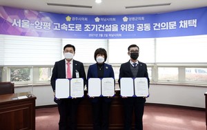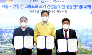 하남시는 3일 시청 시장실에서 김상호 시장을 비롯해 광주시 신동헌 시장, 양평군 정동균 군수가 참여한 가운데 ‘서울~양평 간 고속도로 조기 건설을 위한 공동건의문’을 채택, 국토교통부와 기획재정부 등 관계 기관에 건의하기로 했다고 밝혔다.하남시 등 3개 시·군은 지난 2018년 ‘서울~양평 간 고속도로 건설’의 조속한 추진 등 공동 대응키로 하는 업무협약을 체결했다.그러나 2019년 해당 건설 사업이 예비타당성조사 대상사업으로 선정된 이후 현재까지 조사가 끝나지 않고 있자 공동의 목소리를 내기로 한 것이다.건의문에는 서울~양평 고속