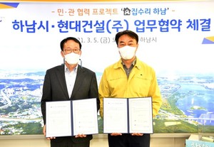 하남시는 지난 5일 하남시청 시장실에서 원 도심 취약계층 주거환경 개선을 위한 민·관 협력 프로젝트 '집수리 하남?!’'사업 업무협약을 현대건설과 체결했다고 밝혔다.이날 협약식은 김상호 시장과 오태진 현대건설 상무 등 관계자가 참석한 가운데 진행됐으며, 현대건설은 이번 협약으로 신세계건설과 롯데건설, 하남시사회복지협의회에 이어 ‘집수리 하남?!’사업의 새로운 파트너로 참여하게 됐다.협약에 따라 하남시는 집수리 대상가구 발굴과 선정 등 행정적 지원을 맡고, 현대건설은 무상 집수리를 위한 인력과 자재 등을 지원하게 된다.현대건설 오태진