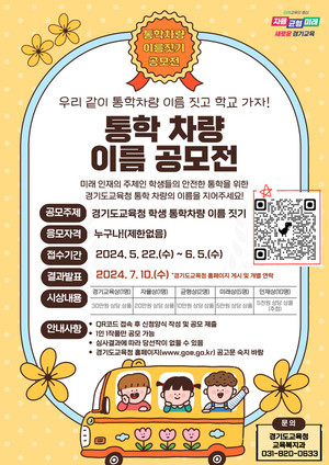 경기도교육청(교육감 임태희)이 5월 22일부터 6월 5일까지 ‘통학차량 이름짓기’ 공모전을 개최한다.교육공동체의 다양한 생각을 발굴하고 지역과 학교 여건을 반영한 통학 차량을 상징성 있고 쉽게 기억할 수 이름으로 선정하고자 한다.도내 학생, 학부모, 교직원 누구나 참여할 수 있으며 1인 1 작품만 공모 가능하다. 포스터의 큐알코드에 접속 후 작품 규격, 응모 방법을 확인하고 신청양식을 제출하면 된다.수상작은 도교육청 소속 교직원 투표를 거쳐 관계 공무원, 전문가, 학생, 학부모 등으로 구성된 심사위원회에서 최종 선정하며 선정 결과는