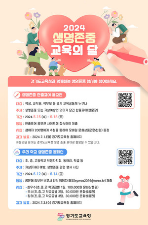 경기도교육청(교육감 임태희)이 생명존중 문화를 확산하기 위해 학생, 학부모, 교직원 모두 참여하는‘생명존중 교육의 달’을 6월 30일까지 운영한다.먼저 학생의 생명존중 인식을 높이기 위해 ‘생명존중 한 줄 표어 응모전’을 6월 15일까지 운영한다. 학생 눈높이에서 생명존중이나 자살예방의 의미가 담긴 한 문장을 포스터 큐알코드에 접속한 후 제출하면 된다.또, 초·중·고등학교에서 학급이나 동아리별로 등교 캠페인, 사진전, 작은 음악회 등 자율적으로 생명존중 프로그램을 운영하고 참여한 사진을 담당자 메일(http://sywoo2016@k