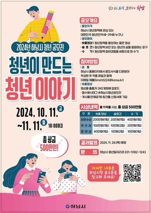 하남시(시장 이현재)가 내달 11일까지 ‘2024년 청년 공모전 「청년이 만드는 청년 이야기」’ 응모작을 접수한다.이번 공모전은 청년정책의 이해도를 높이고 공감대를 형성하기 위해 청년 주민참여예산으로 마련됐다.응모분야는 숏폼영상, 슬로건, 수기 총 3가지로 하남시 청년정책에 관심 있는 대한민국 청년(만19~39세) 누구나 참여할 수 있고, 개인 또는 3인 이하의 팀이 최대 3점(분야별 1점)까지 응모 가능하다.시는 이번에 출품된 작품 중 숏폼 영상 분야 3팀(최대 200만원), 슬로건 분야 5팀(최대 20만원), 수기 분야 3팀(최