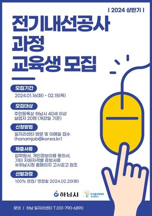 하남시(시장 이현재)가 한국폴리텍대학 성남캠퍼스와 함께 미취업 하남시민을 위한 기술 전문 직업훈련을 운영한다고 15일 밝혔다.이번 직업훈련은 ‘전기내선공사과정’으로, 전기 관련 경력 및 교육 경험이 없는 사람을 위해 한국폴리텍대학 성남캠퍼스의 교수진과 실제 현장과 같은 실습을 통해 기술 전문직으로 거듭날 수 있는 교육과정이다.지원 자격은 개강일(2월 26일 예정) 현재 40세 이상 고용보험 미가입 하남시민이며, 신청은 1월 16일부터 2월 15일까지 하남일자리센터에 방문 및 이메일로 접수하고 100% 면접으로 교육생을 선발할 계획이