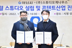 하남시(시장 김상호)는 지난 12일 ㈜스튜디오게니우스(대표 양우석)와 업무협약을 맺고 하남시 문화산업 생태계 강화를 위해 상호 협력하기로 했다고 밝혔다.하남시청에서 가진 협약식에는 하남시를 대표해 김상호 시장과 기업지원 및 문화예술 관련 시 관계자 등이 참석했다. (주)스튜디오게니우스에서는 양우석 대표(영화감독)·박성배 이사, 한주연 컨설턴트가 참석해 자리를 빛냈다.하남시는 이번 협약을 통해 양 기관이 ▲디지털 스튜디오(영화촬영소) 설립 ▲콘텐츠산업 진흥을 위한 인적·물적 및 정보교류 ▲문화예술 프로그램 개발 및 육성 ▲공동사업 발
