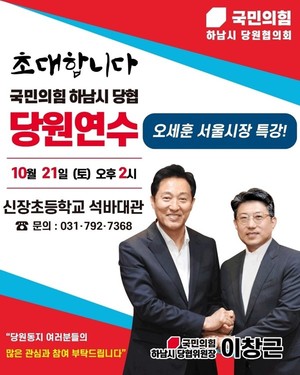 국민의 힘 하남시 당원협의회는 오는 21일 토요일 오후 2시 신장초등학교 석바대관에서 하남시 관내 당원연수를 앞두고, 오세훈 서울시장이 특별강사로 나선가운데 6개월 앞으로 다가온 총선준비로 벌써부터 뜨겁다.하남시의 국민의 힘 당원협의회는 지난 8월부터 거리에 나서서 공격적으로 신규당원 모집에 나서는 등 지역 밀착 행보로 새로운 지역 공약 개발과 총선 전략 수립을 위해 당원연수를 준비했다고 밝혔다.이창근 하남시 당협위원장은 오세훈 서울시장과의 깊고 오랜 인연을 내세우며 “현직 광역단체장이 타 시도의 당원연수에 나서는 경우는 극히 이례