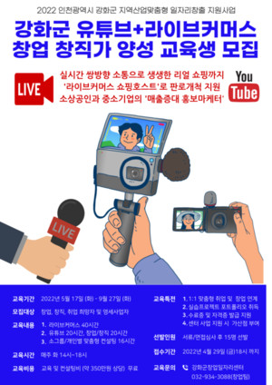 강화군 창업·일자리센터(센터장 윤정혁, ‘센터’)는 인천시 주관 2022년 지역·산업맞춤형 일자리창출 지원사업 ‘강화군 농특산물, 관광자원 마케팅 전문 유튜브・라이브커머스 창업・창직가 양성’ 훈련생을 15명을 모집한다고 밝혔다.미취업자, 예비창업자, 졸업예정자, 영세자영업자를 모집 대상으로 하며 교육 내용은 라이브커머스 40시간, 유튜브 20시간, 창업・창직 20시간, 단체(소그룹) 컨설팅 10시간, 1:1 컨설팅(교육생 맞춤형)으로 구성되어 있다. 접수 기간은 2022. 4. 7.(목)일부터 4. 29.(금)일 18:00시 까지,