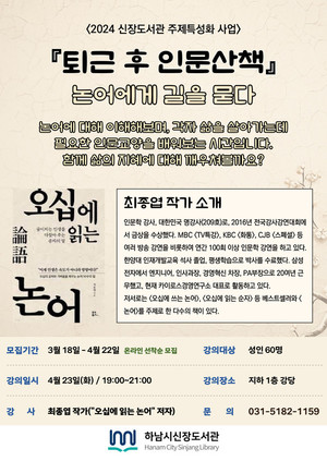 하남시(시장 이현재)는 직장인을 대상으로 진행되는 야간 인문학 강연인 ‘퇴근 후 인문산책’ 참여자를 오는 18일부터 모집한다고 밝혔다.‘퇴근 후 인문산책’은 평일 낮에 강연을 듣기 어려운 직장인을 위해 오후 7시부터 9시까지 신장도서관에서 진행하는 야간 인문학 강연이다. 하남시는 직장인을 대상으로 한 특색있는 인문 주제와 그에 알맞은 체험형 과정을 제공하는 강의가 마련되면 좋겠다는 시민 의견을 반영해 처음으로 퇴근 후 인문산책 프로그램을 기획하게 됐다.각 강연은 주제별로 ▲4월 23일(화) 철학(60명) ▲5월 30일(목) 커피(2