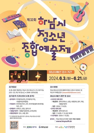 하남시청소년수련관(관장 조재영)은 ‘제32회 하남시청소년종합예술제 하남시대회’ 참가 청소년을 모집한다고 밝혔다.하남시가 주최하고 하남시청소년수련관이 주관하는 제32회 하남시청소년종합예술제는 청소년의 문화적 감성과 예술적 재능을 계발하여 청소년 문화를 확산하고, 청소년들이 함께 어울리며 서로의 감성을 공유할 수 있는 교류의 장이다.경연 종목은 △음악 분야(한국음악 성악, 한국음악 기악, 서양음악 성악합창) △무용 분야(한국무용 독무, 한국무용 군무, 외국무용 독무, 외국무용 군무) △문예 분야(문학 시/산문, 일러스트) △사물놀이 분