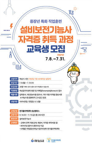 하남일자리센터는 종합기술전문학교인 한국폴리텍대학 성남캠퍼스와 협업으로 중장년 하남시민을 위한 기술 전문 직업훈련과정인‘설비보전기능사 자격증 취득 과정’을 신규로 운영한다고 9일 밝혔다.설비보전기능사는 제조업, 건설업, 발전소, 통신 및 IT 산업 등 다양한 분야의 산업 현장에서 설비의 정비와 유지보수를 위해 필수적인 기술을 제공한다. 이는 설비 유지보수의 중요성이 점점 강조되는 현대 산업사회에서 매우 중요한 역할을 하고 있기에 장기적으로도 안정적인 취업 전망을 가지고 있다고 보여진다.지원자격은 개강일 기준(8월 14일 예정) 40세