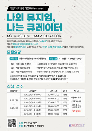 (재)하남문화재단 하남역사박물관(이사장 이현재)은 여름방학을 맞이하여 다양한 연령대가 함께 참여하는 다채로운 역사교육 프로그램을 운영한다고 밝혔다.하남시 유일의 공립박물관인 하남역사박물관은 그동안 관내 역사문화자원을 기반으로 실감관 조성 등의 상설전시 개편과 하남의 지역사 및 우리나라의 역사를 근간으로 다수의 특별전을 개최해왔다. 이러한 전시와 학술연구를 통해 얻은 다양한 콘텐츠를 바탕으로 창의적으로 기획한 교육프로그램을 운영하여 다양한 계층의 관람객과 시민을 만나고 있다.하남역사박물관은 이번 여름방학을 맞이하여 세 가지 교육프로그