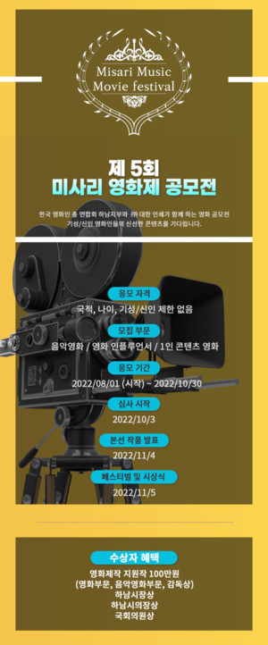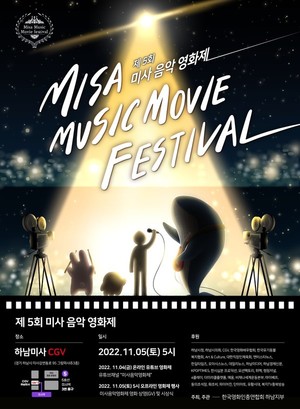 (사)한국영화인총연합회 하남지부(회장 장인보, 이하 연합회)는 '제5회 미사리음악영화제'를 CGV 하남미사에서 오는 11월 5일 개최할 예정이라고 밝혔다.이번 행사는 연합회에서 주최 및 주관을 진행하기로 했으며, 하남시· 하남시의회· 한국예술인총연합회 하남지부가 지원하며, 한국영화인총연합회·한국영화배우협회에서 후원한다.올해 5회째를 맞이하는 미사리음악영화제는 음악과 영화의 만남을 통해 일상에서 느낄 수 있는 '자유로운 상상을 그리다'에 초점을 맞춰 단편 및 장편 영화에 표현한 출품작을 공모하며, 응모는 만1~100세까지 누구나 참여