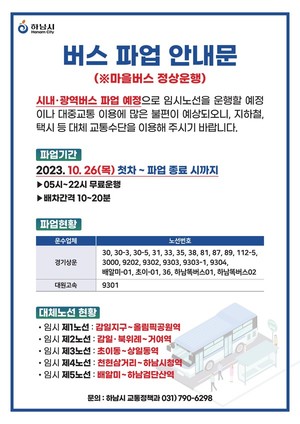 하남시 (시장 김상호)는 경기도시내버스노동조합이 26일부터 파업을 예고한 가운데, 시민 불편을 최소화하기 위해 비상수송차량(셔틀버스) 무료운행 등 비상대책을 마련했다고 25일 밝혔다.시는 파업 예고 시간인 26일 새벽 4시부터 오후 23시까지 비상수송차량 30대를 관내 3개 임시 노선을 따라 출퇴근 시간에는 10분 간격으로 운행한다.3개 임시노선 중 주요 노선을 살펴보면 △감일지구에서 올림픽공원역 △위례지구에서 장지역 △은고개에서 검단산역 등을 거치는 3개 노선이다.마을버스 및 지하철은 정상 운행할 예정이다.아울러 시는 파업 상황에