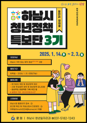 하남시(시장 이현재)는 시와 청년 간 가교 역할을 수행하는 ‘제3기 청년정책특보단’을 다음달 3일까지 모집한다고 14일 밝혔다.하남시는 청년 인구가 약 8만7천명으로 전체 시민 중 약 27%를 차지하고 있으며, 2023년 청년일자리과 신설 이후 청년들의 일자리, 주거, 교육, 복지·문화, 참여·권리 등 다양한 분야에서 차별화된 정책을 추진하고 있다.그 중 ‘청년명예시장 및 청년정책특보단’은 2023년 ‘전국 최초’로 도입되어, 청년의 능동적인 시정참여로써 시정운영 및 정책에 청년의 목소리를 반영하는 역할을 하고 있다.‘청년메이트’라