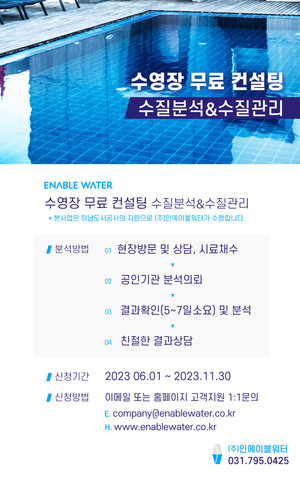 (주)인에이블워터(대표 이정민)은 하남도시공사에서 지원하는 2023년 스타트업 사업화 패키지 지원사업을 통해 「관내 사설 수영장의 수질분석 및 운영비 절감을 위한 컨설팅」을 무료로 진행한다고 밝혔다.(주)인에이블워터는 지난해 10월 하남시에 설립한 수영장 물 관리 전문업체로서 주요사업은 ▲온라인 수영장 운영 관리 서비스 ▲친환경 저 에너지 수영장 설비 공법 ▲기타 수영장 기자재 등 이다.최근 3월에는 국내 최초로 영국 수영장 협회 정식회원으로 선정되었으며, 경기도 경제 과학 진흥원과 하남도시개발공사에서 다수의 지원 사업 선정 등 수