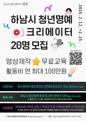 하남시(시장 이현재)가 청년들의 창의력이 마음껏 발휘될 ‘청년명예크리에이터 양성과정’을 개설하고, 반짝이는 아이디어와 뜨거운 열정을 가진 청년 20명을 모집한다.‘청년명예크리에이터 양성과정’은 2024년 청년 주민참여예산을 통해 탄생한 프로젝트로, 청년들은 직접 취재한 내용을 영상과 카드뉴스로 제작해 하남시를 홍보하는 역할을 맡게 된다.단순한 교육과 콘텐츠 제작활동에 그치지 않고, 주요 정책 현장과 행사에 참여하며 특별 미션을 수행하는 등 실전 경험을 통해 성장할 소중한 기회가 주어진다.교육은 3월부터 5월까지 매주 토요일, 총 1