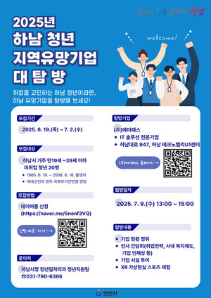 하남시(시장 이현재)가 지역 대표 혁신기업 ㈜에어패스와 협력해 청년 대상 진로탐색 프로그램인 ‘하남청년 지역유망기업 대탐방 프로그램’을 추진한다.참가 대상은 하남시 청년 중 미취업자이며, 오는 7월 2일까지 선착순으로 20명을 모집한다.이번 프로그램은 하남시 풍산동에 본사를 둔 IT솔루션 전문기업 ㈜에어패스와의 협업으로 마련됐다. 에어패스는 XR(확장현실) 분야에서 에듀테크 콘텐츠, 시뮬레이션 교육훈련 콘텐츠, 인터랙티브 전시 기술 등 실생활 밀착형 서비스를 제공하며 주목받는 기업이다.7월 9일로 예정된 기업 탐방 프로그램은 ▲산업