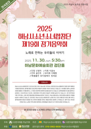 하남시소년소녀합창단(단장 신영자)은 오는 30일(일) 오후 5시 30분, 하남문화예술회관 검단홀에서 제19회 정기음악회를 개최한다고 밝혔다.이번 정기음악회는 ‘노래로 전하는 우리들의 이야기’를 부제로, 단원들이 1년 동안 갈고닦은 음악적 성취와 열정을 무대에서 선보이는 자리다. 창작동요, 국악동요, 키즈팝, 뮤지컬 등 여러 장르가 어우러져 관객들에게 풍성하고 감동적인 공연을 전달할 예정이다.특히, 뮤지컬 배우 정세윤이 특별출연해 합창단과 함께 따뜻하고 완성도 높은 협연 무대를 꾸미며 기대감을 높인다.2005년 창단된 하남시소년소녀합