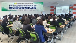 하남시육아종합지원센터(강성례센터장)는 관내 어리이집 원장 및 보육교사를 대상으로 24일 ‘놀이중심숲생태교육’을 진행했다고 밝혔다.올해로 3년째 실시하는 자연 ·놀이 ·아동중심‘생태친화보육’을 위한 놀이중심숲생태교육은 해를 거듭할수록 보육교직원들의 관심과 어린이집 교육참여가 늘고 있다. 이번 놀이중심숲생태교육은 총 1,523명 수료하였다.센터에서는 놀이중심숲생태교육을 기본과정 7회차, 심화과정 2회를 2022년 교육이수 원장대상으로 재교육1회차를 진행하고 있다. 이외 어린이집 생태프로그램공모전, 프로그램교육탐방, 생태교육 현판식을 진