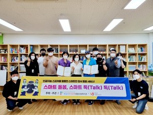 하남시미사강변종합사회복지관(관장 조혜연)은 지난 16일 하남시치매안심센터(센터장 박강용)과 함께 인공지능돌봄서비스 ‘스마트 돌봄, 스마트 톡(talk) 톡(talk)’ 사업 진행을 위한 스마트돌봄매니저 임명식을 진행하고 인공지능스피커 사용 교육을 진행했다고 밝혔다.'스마트 돌봄, 스마트 톡(talk) 톡(talk)' 사업은 지난 5월 23일 복지관과 치매안심센터가 업무협약을 체결하고 치매안심마을인 미사강변 13단지 주민 30가구를 대상으로 직관적인 대화로 사용이 가능한 인공지능 스피커를 각 세대에 보급하여 치매예방을 위한 음악감상,