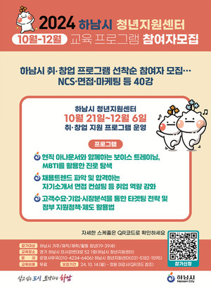 하남시(시장 이현재)가 최신 채용 트렌드를 분석한 취업 전략과 성공적인 창업시장 진입을 위한 창업마케팅 등 취·창업 역량을 강화하는 맞춤형 지원 프로그램에 참여할 청년 희망자를 14일부터 선착순 모집한다.하남시 청년지원센터(경기도 하남시 미사강변대로 52, 하남시 고용복지플러스센터 1층)에서 진행되는 이번 「취·창업 지원 프로그램」은 10월 21일부터 12월 6일까지 청년 취업 역량 강화 등 3개 분야 총 40강 과정으로 운영된다.프로그램 세부 내용을 보면 먼저 청년 역량 강화 파트는 ▲현직 아나운서와 함께 배우는 보이스 트레이닝
