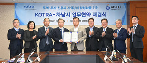 하남시(시장 이현재)는 지난 24일 대한무역투자진흥공사(사장 유정열, 이하 KOTRA)와 하남시 소재 기업의 투자유치 확대 및 수출기업의 무역을 지원하는 등의 상호 협력을 강화하기 위한 업무협약을 체결했다고 밝혔다.염곡동 KOTRA 본사에서 가진 협약식에는 하남시를 대표해 이현재 시장과 투자유치단 주기용 단장 및 박봉규 위원, 하남시기업인협의 문양수 회장 등이 참석했다. KOTRA에서는 유정열 사장을 비롯해 투자유치실장 및 각 분야 팀장들이 참석해 상호 협력을 다짐했다.하남시는 이번 협약을 통해 양 기관이 ▲하남시 기업의 해외진출