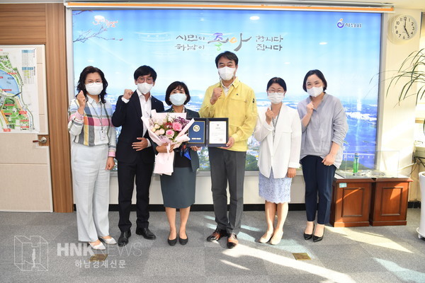 김상호 시장은 이날 하남시육아종합지원센터 강성례 센터장에게 ‘2021 육아종합지원센터 종사자’ 도지사 표창을 전달하고 감사의 뜻을 전했다.