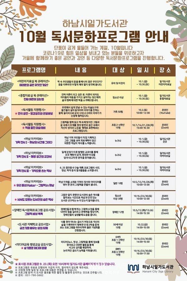 10월에 진행하는 독서문화프로그램은 코로나19 방역 지침에 따라 일정이 변경되거나 취소될 수 있다. 자세한 문의사항은 하남시 일가도서관(☎031-790-5682)으로 연락하면 안내받을 수 있다.