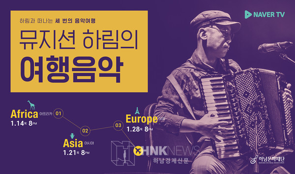 갑갑한 코로나 일상, 훌쩍 떠나보는 여행이 간절한 시대이다. 하남문화재단(이사장 김상호)은 시민들의 지친 마음을 다독여줄 <뮤지션 하림의 여행음악> 시리즈를 1월 한 달 간 온라인으로 생중계한다. 평소 접하기 어려운 세계 곳곳의 다양한 음악을 통해, 낯설지만 매력적인 체험을 선사하는 무대이다.
