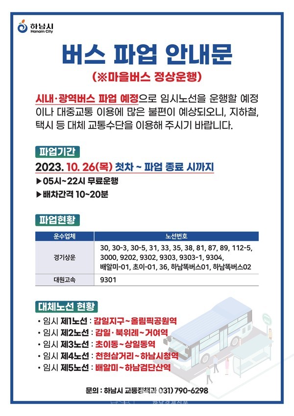 하남시(시장 이현재)는 경기도시내버스노동조합이 26일부터 파업을 예고한 가운데, 시민 불편을 최소화하기 위해 비상수송차량(셔틀버스) 무료운행 등 비상대책을 마련했다고 25일 밝혔다.