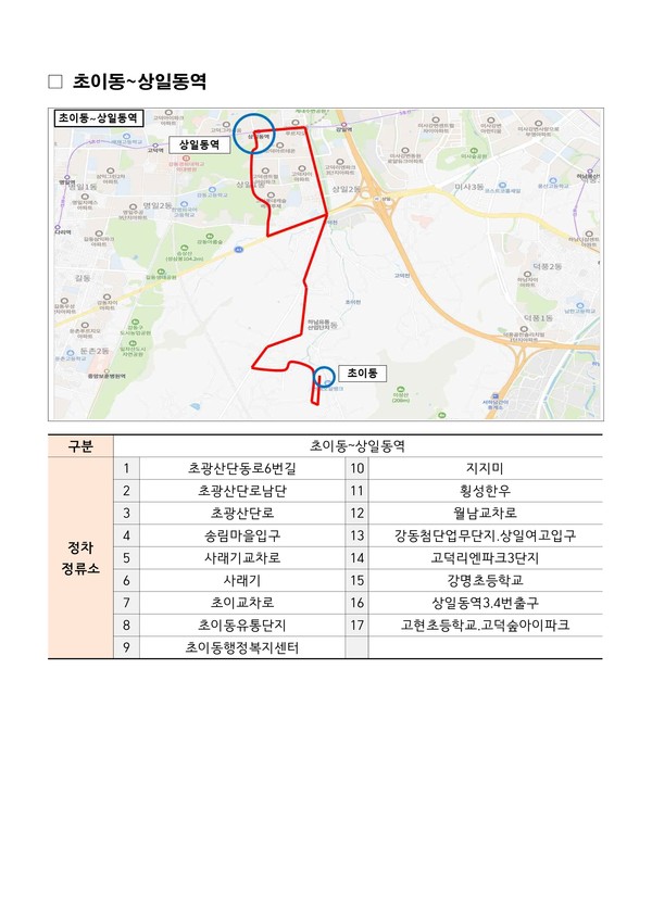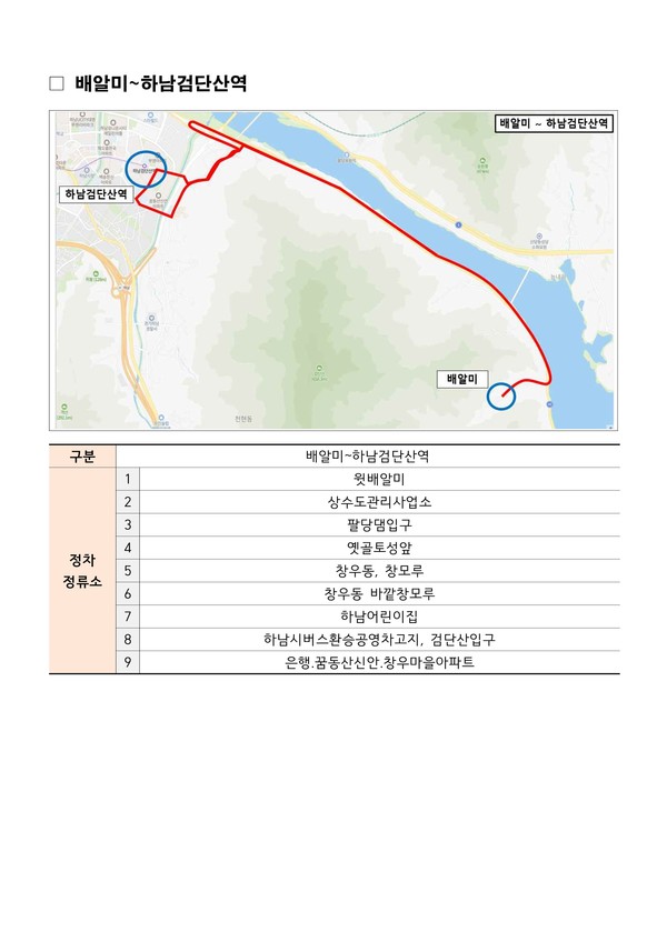 주요 노선을 살펴보면 △감일지구~올림픽공원역, △감일‧북위례~거여역, △초이동~상일동역, △천현삼거리~하남시청역, △배알미~하남검단산역 등을 거치는 5개 노선을 운행한다.
