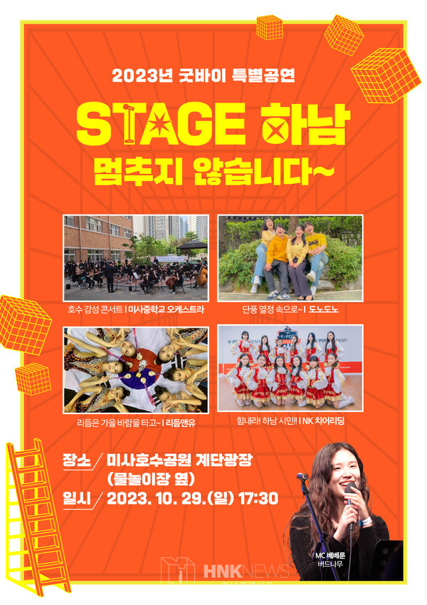 시는 27일 “‘Stage 하남! 2023 굿바이 특별공연’이 29일 오후 5시 30분 미사호수공원 계단광장에서 ‘Stage 하남! 멈추지 않습니다’를 주제로 개최된다”고 밝혔다.