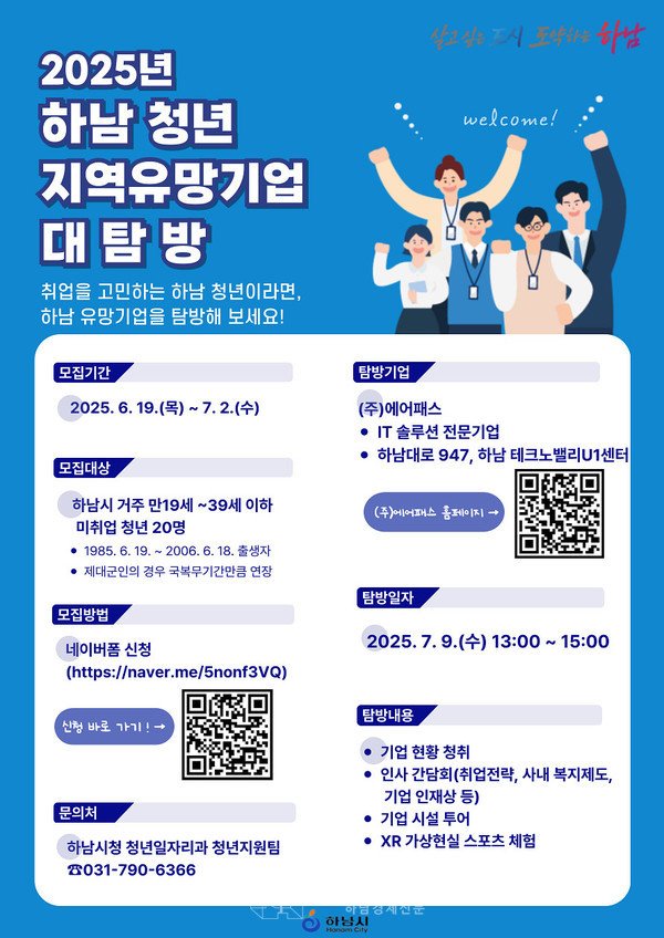하남시(시장 이현재)가 지역 대표 혁신기업 ㈜에어패스와 협력해 청년 대상 진로탐색 프로그램인 ‘하남청년 지역유망기업 대탐방 프로그램’을 추진한다.