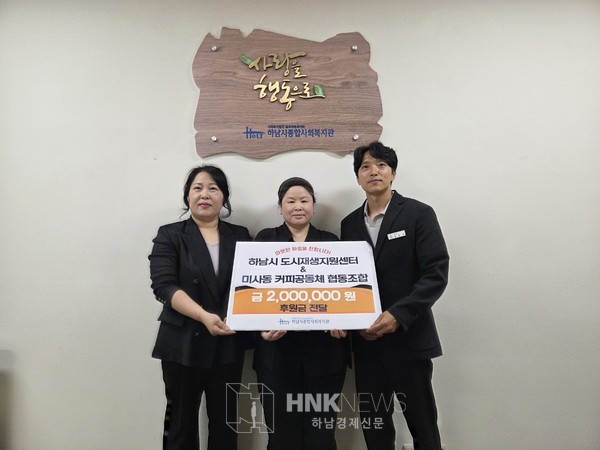 기부금 전달식은 15일(화) 오전 10시 하남시종합사회복지관에서 열렸으며, 하남시 도시재생지원센터를 담당하는 방현준 하남시 신도시관리팀 팀장과 김현경 미사동커피공동체협동조합 대표, 김혜성 하남시종합사회복지관 관장이 참석했다.