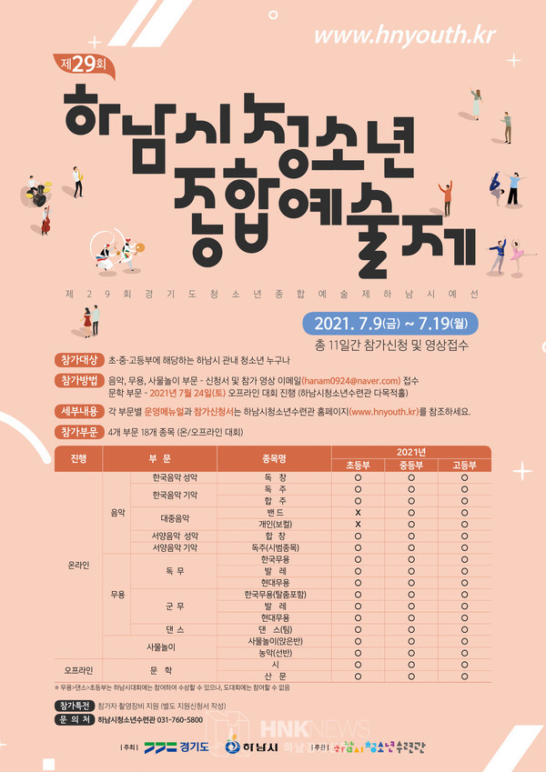 하남시청소년수련관(관장 조재영, 이하 수련관)은 7월 9일(금) ~ 7월 19일(월) 11일간 제29회 경기도청소년종합예술제 하남시대회 참가자를 모집한다고 밝혔다.